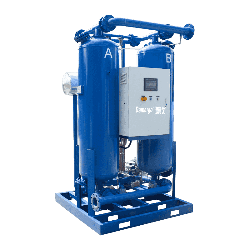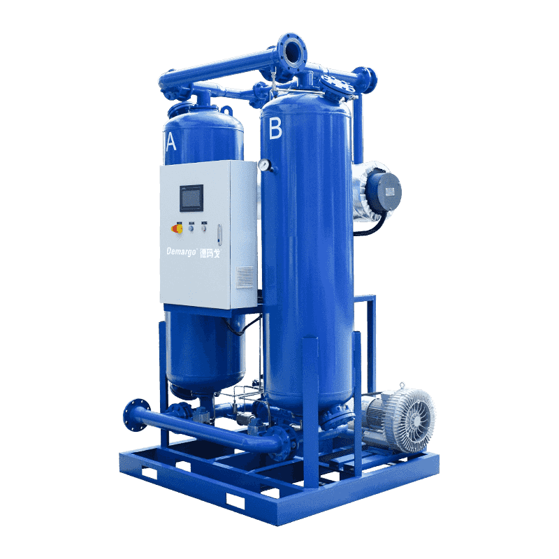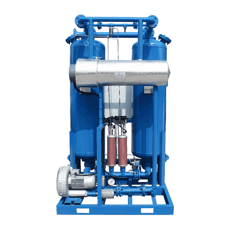 লো-গ্যাস সেবন বিস্ফোরণ তাপ পুনর্জন্মের শোষণ ড্রায়ার হিটিং রিজেনারেশন ড্রায়ারের অন্তর্গত। এর কার্যকরী নীতিটি হ'ল পরিবেষ্টিত বায়ু নিষ্কাশন করার জন্য একটি ব্লোয়ার ব্যবহার করা এবং তারপরে গরম করার পরে হিটিংয়ের পরে শোষণ টাওয়ারে ডেসিক্যান্টকে পুনরায় জেনারেট করা, গরমের পর্যায়ে মাইক্রো-হিট পুনর্জন্মের শোষণ ড্রায়ারের গ্যাস ক্ষতি এড়ানো। ঠান্ডা-ফুঁকানো পর্যায়টি সমাপ্ত গ্যাসের অংশের পরিবর্তে পোস্ট-কুলিং ব্যবহার করে, এইভাবে শক্তি সর্বাধিক পরিমাণে সঞ্চয় করে। এটি "শক্তি সঞ্চয় এবং নির্গমন হ্রাস" প্রভাব সহ একটি শোষণ ড্রায়ার যা আমার দেশের জাতীয় নীতির সাথে সঙ্গতিপূর্ণ। হিটিং রিজেনারেশন ড্রায়ারের পুনর্জন্ম শক্তি খরচ দুটি রূপ রয়েছে, প্রথমটি হ'ল তাপ শক্তি হ'ল অ্যাডসরবেন্টকে ডেসারপশন তাপমাত্রায় পৌঁছাতে এবং জল বাষ্পীভূত করার জন্য প্রয়োজনীয়, এবং দ্বিতীয়টি হ'ল তাপ বাহক এবং শীতল মাধ্যম হিসাবে ব্যবহৃত গ্যাস। বিস্ফোরণ হিটিং রিজেনারেশন ড্রায়ারে, যেহেতু পরিবেষ্টিত বায়ু তাপ শক্তি বাহক হিসাবে ব্যবহৃত হয়, সংকুচিত বায়ু খরচ ব্যাপকভাবে হ্রাস করা হয়।